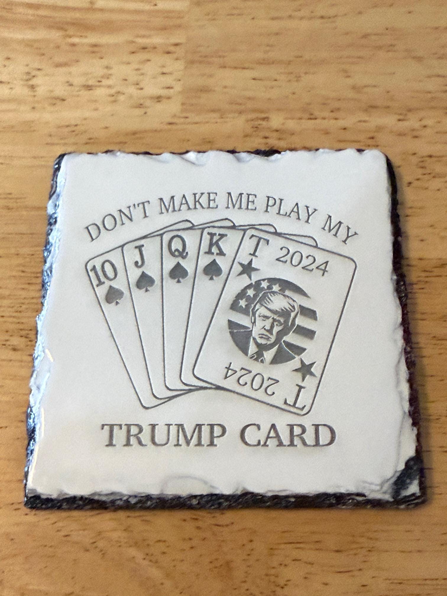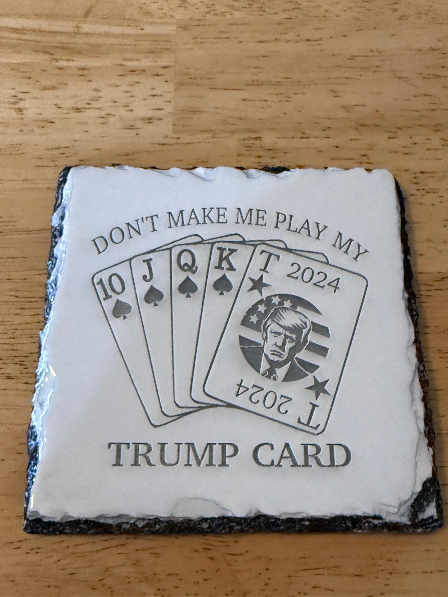 Add a little humor to your table with this laser engraved slate coaster featuring a poker hand and the phrase “Don’t Ask Me For My Trump Card.” Perfect for card players, poker nights, or anyone who enjoys clever wordplay.