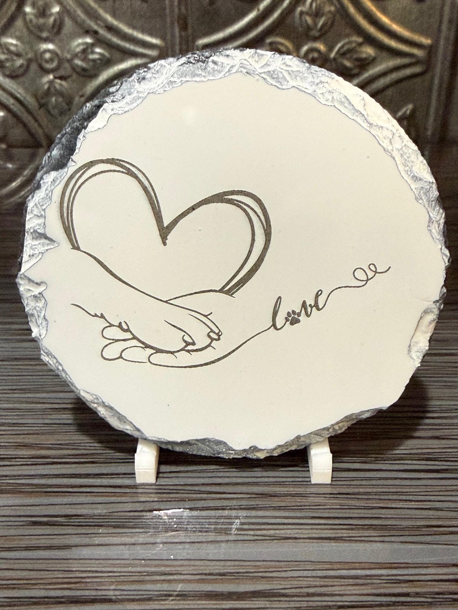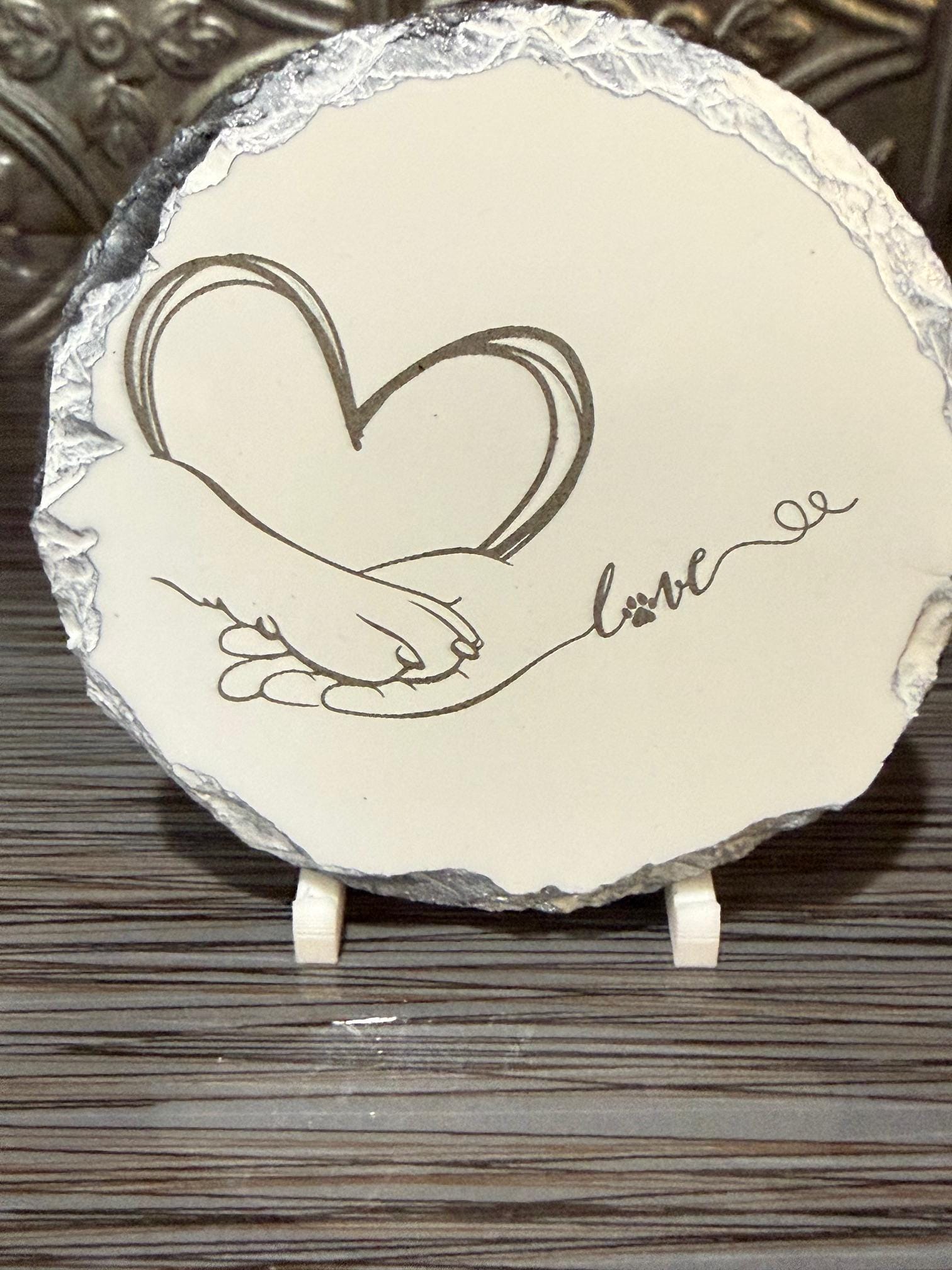 This beautiful laser engraved slate coaster featuring a dog paw and human hand forming a heart is a touching symbol of the special bond between pets and their owners. The simple yet meaningful design represents love, loyalty, and companionship.