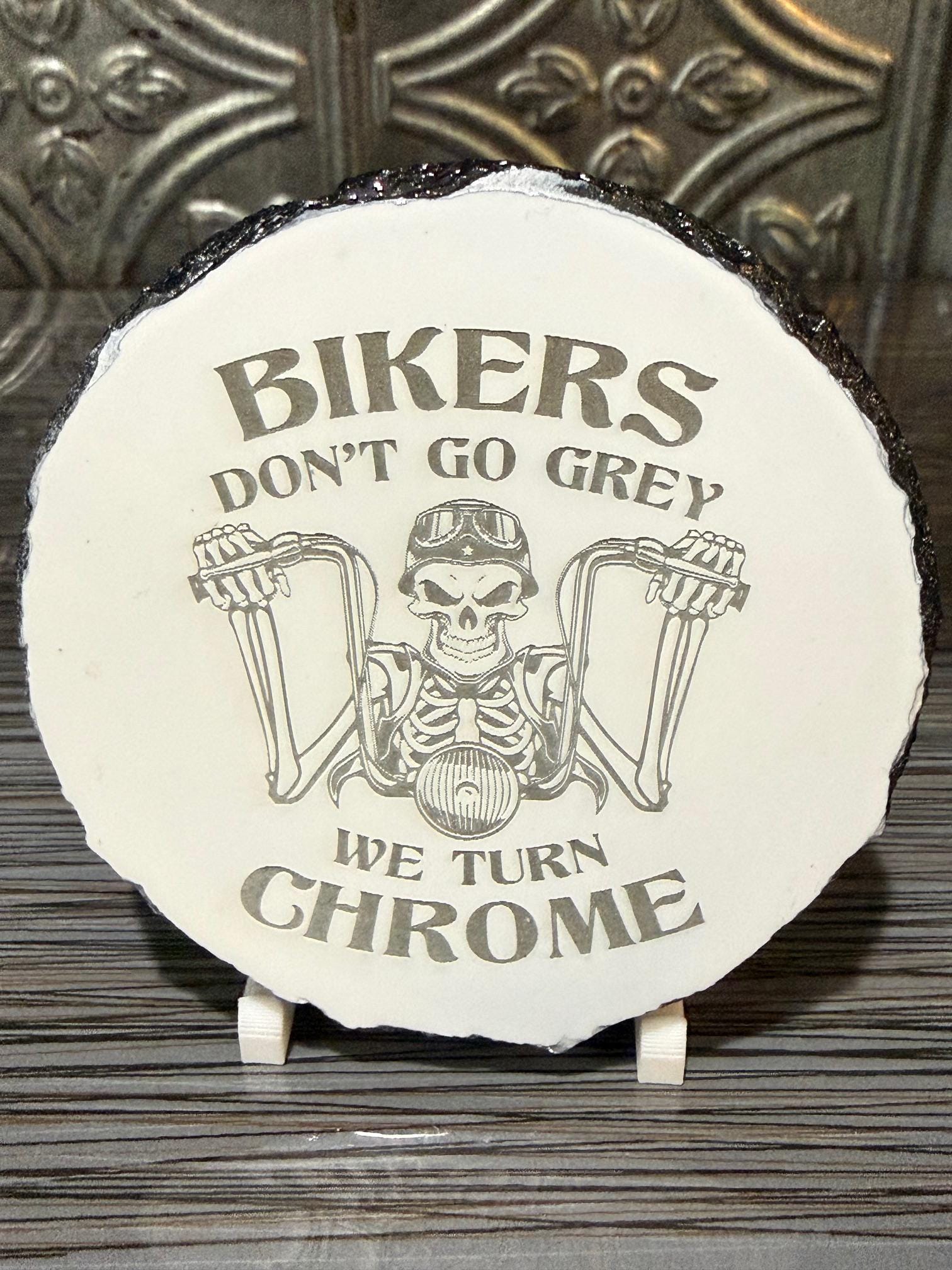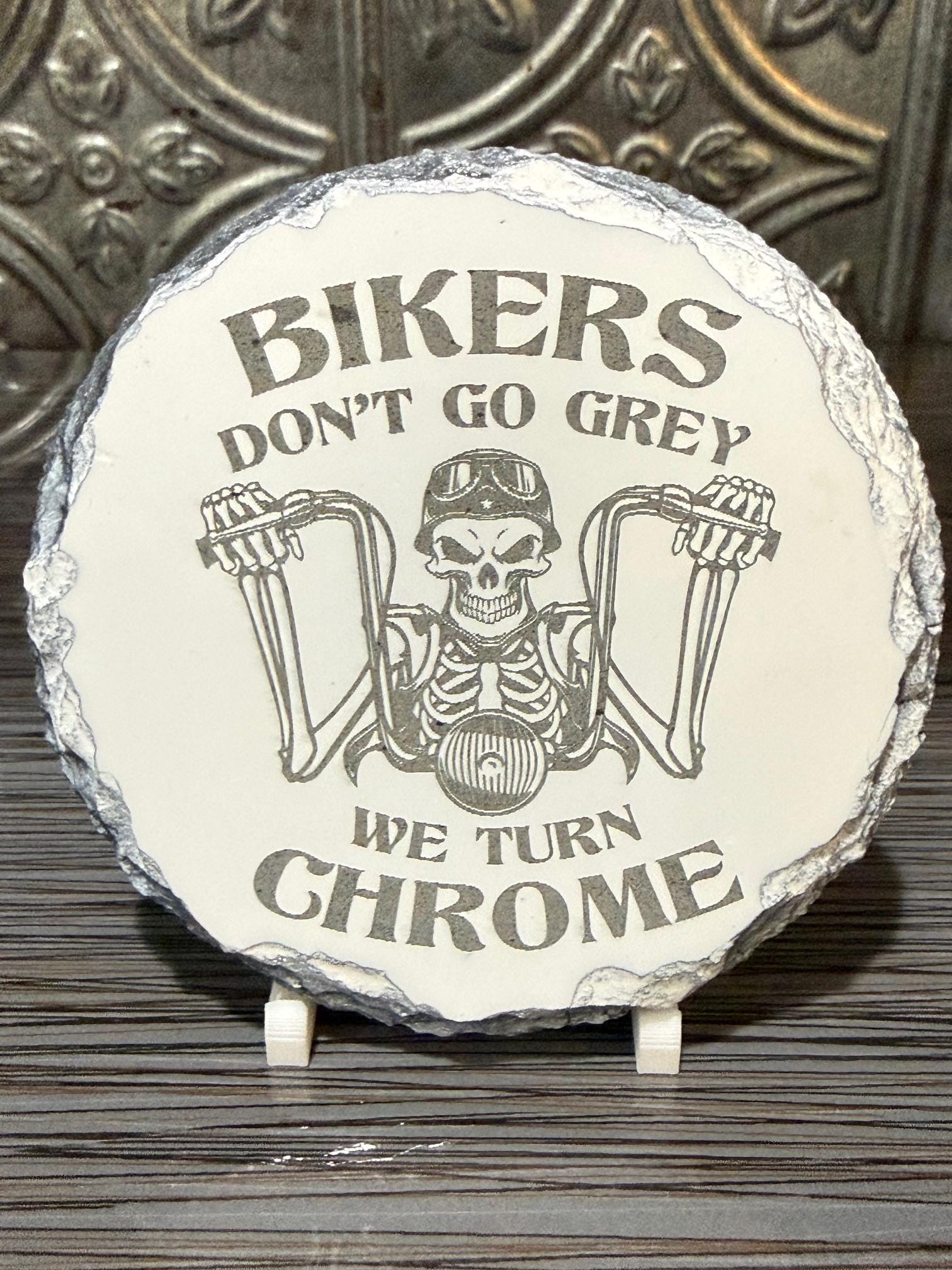 Perfect for motorcycle enthusiasts, this laser engraved slate coaster featuring the phrase “Bikers Don’t Go Grey – We Turn Chrome” celebrates the spirit of the open road. The design includes a bold biker skull with handlebars, making it a great piece for riders who live for the ride.
