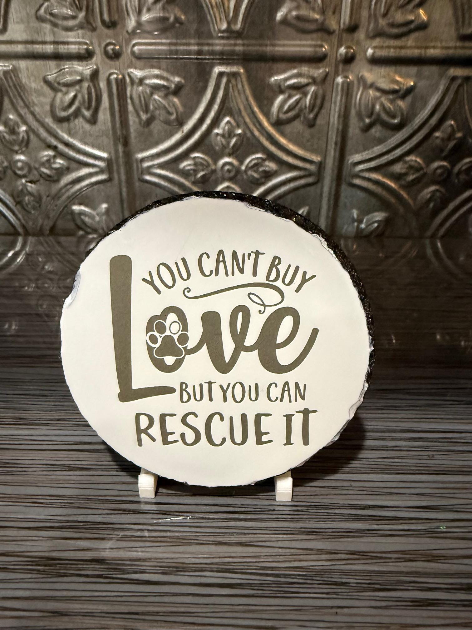 Celebrate the love of rescue animals with this laser engraved slate coaster featuring the heartfelt message “You Can’t Buy Love But You Can Rescue It.” This meaningful design with a paw print detail is perfect for anyone who supports animal rescue and adoption.