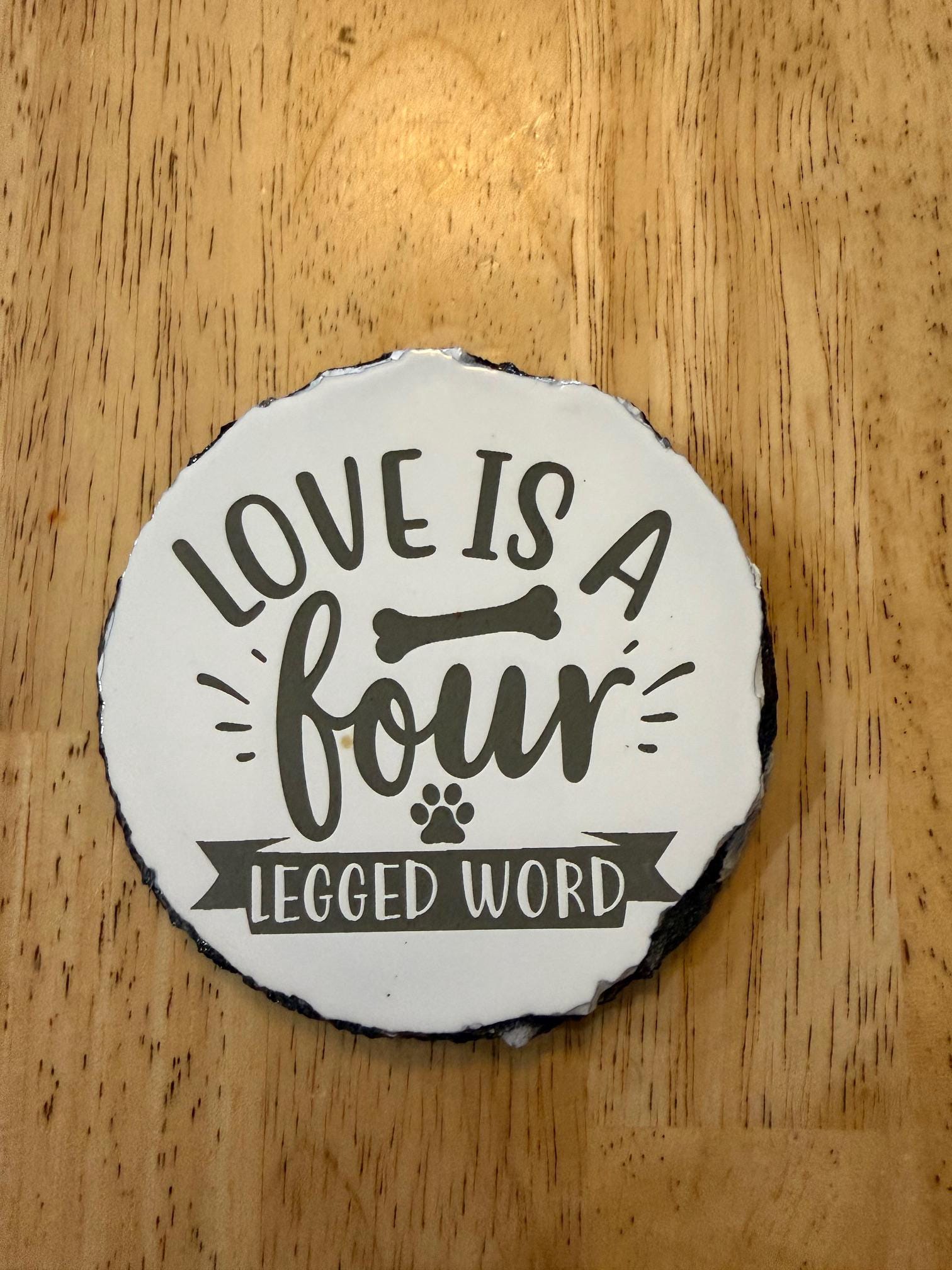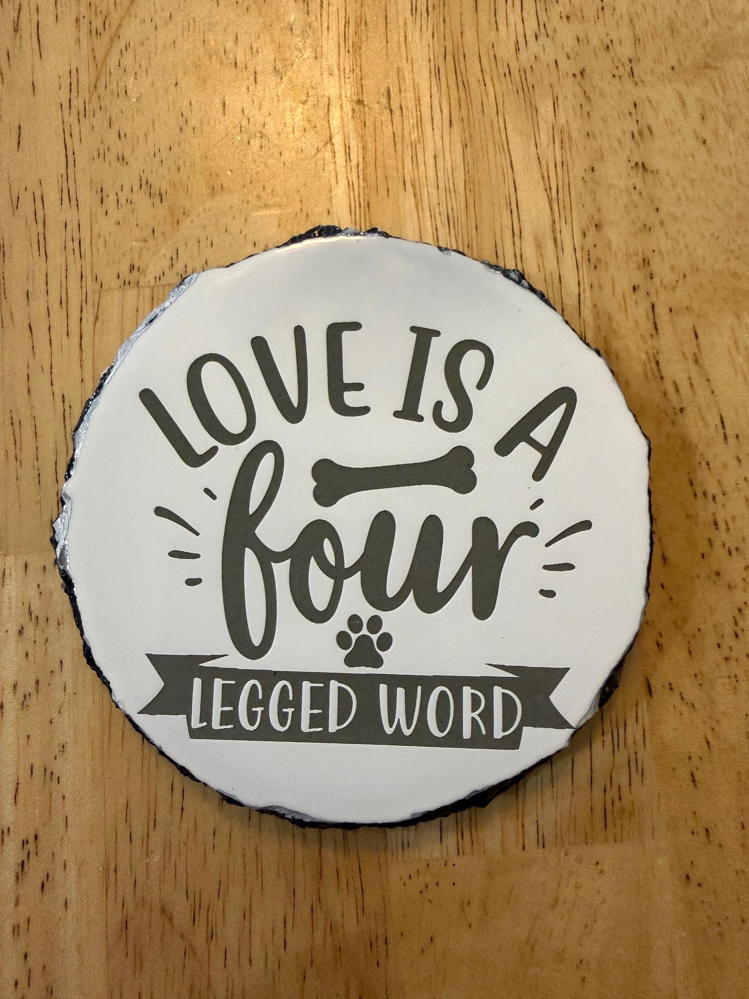 For anyone who believes dogs truly are family, this laser engraved slate coaster featuring the phrase “Love Is a Four Legged Word” is a perfect addition to your home. The design includes a playful bone and paw print that adds a fun touch for dog lovers.