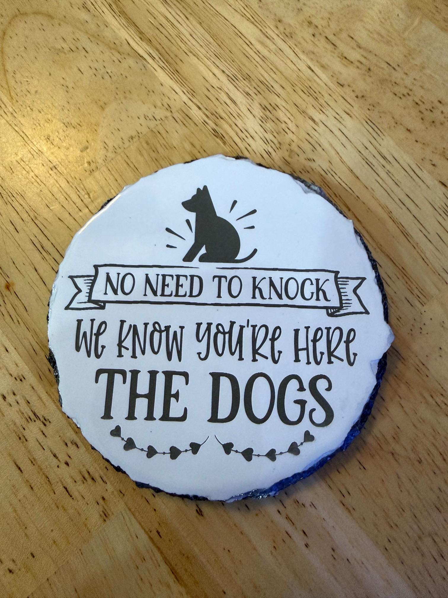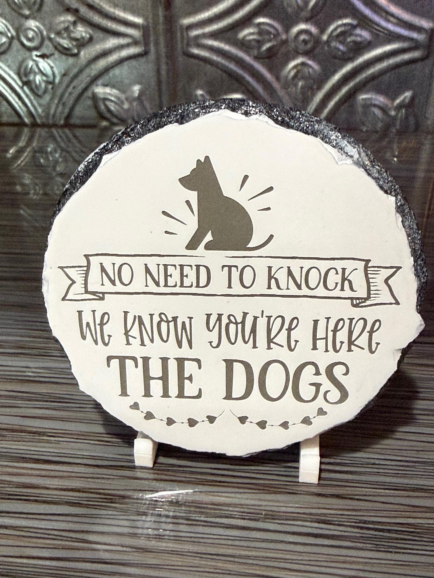Add humor and personality to your home with this “No Need To Knock, We Know You're Here – The Dogs” decorative sign. This rustic-style plaque is perfect for dog lovers who know their pups are always the first to announce visitors.