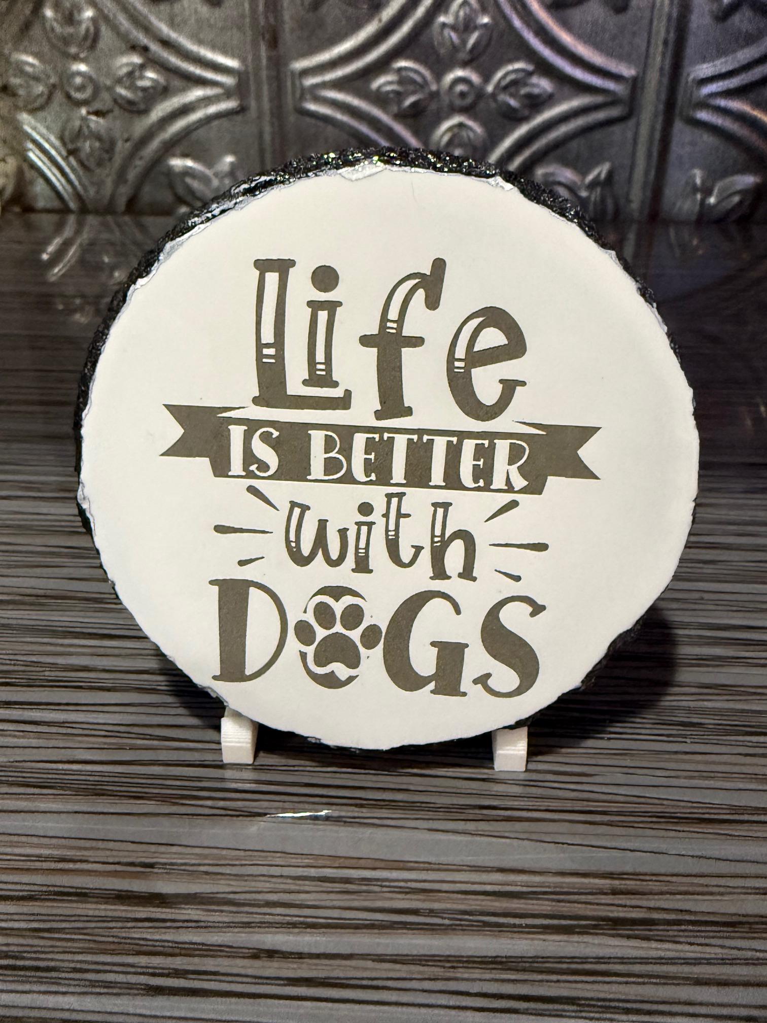 elebrate the joy dogs bring to everyday life with this “Life Is Better With Dogs” drink coaster. Designed for dog lovers, this coaster features stylish lettering and a cute paw print accent that makes it both fun and practical.