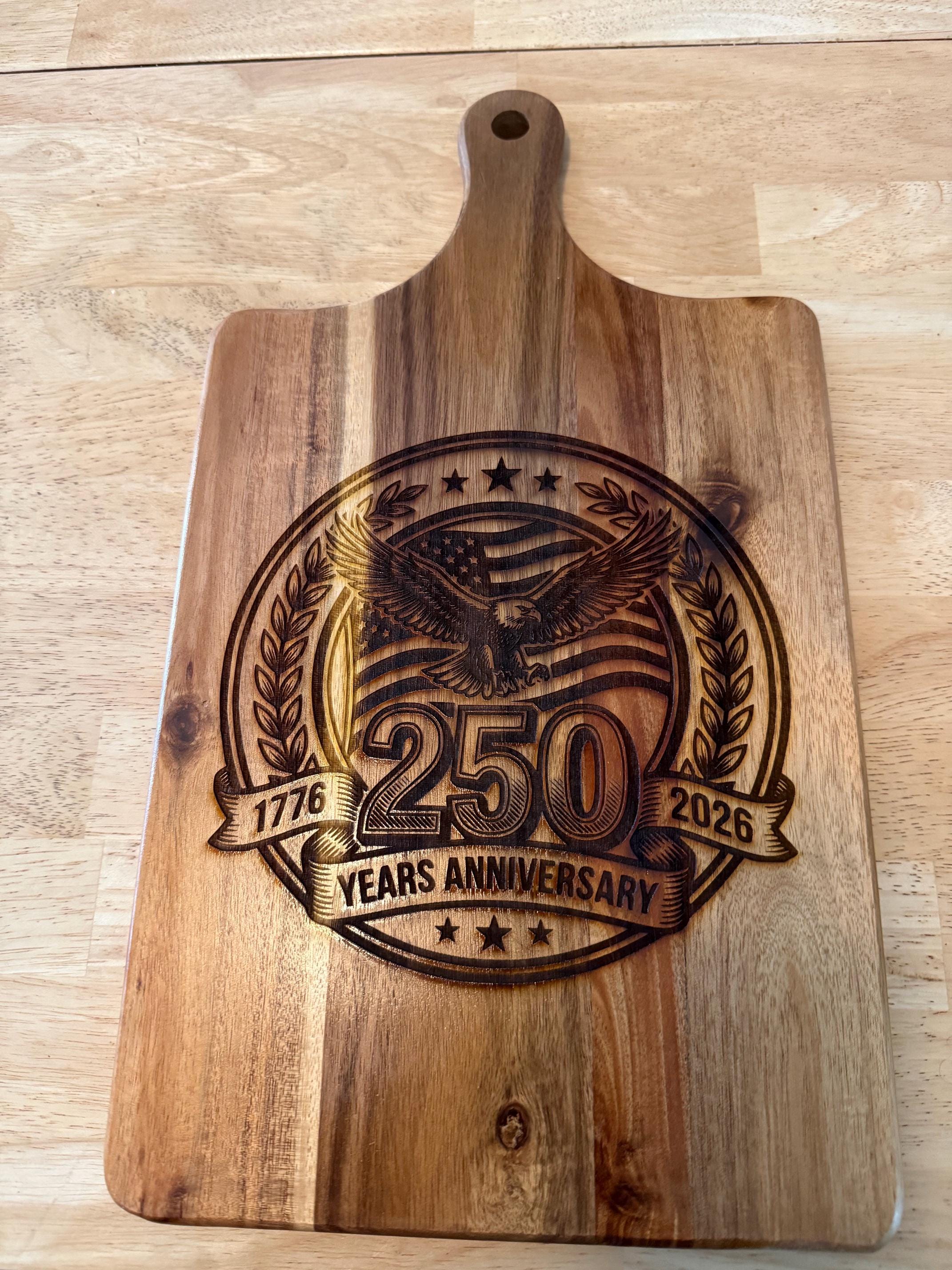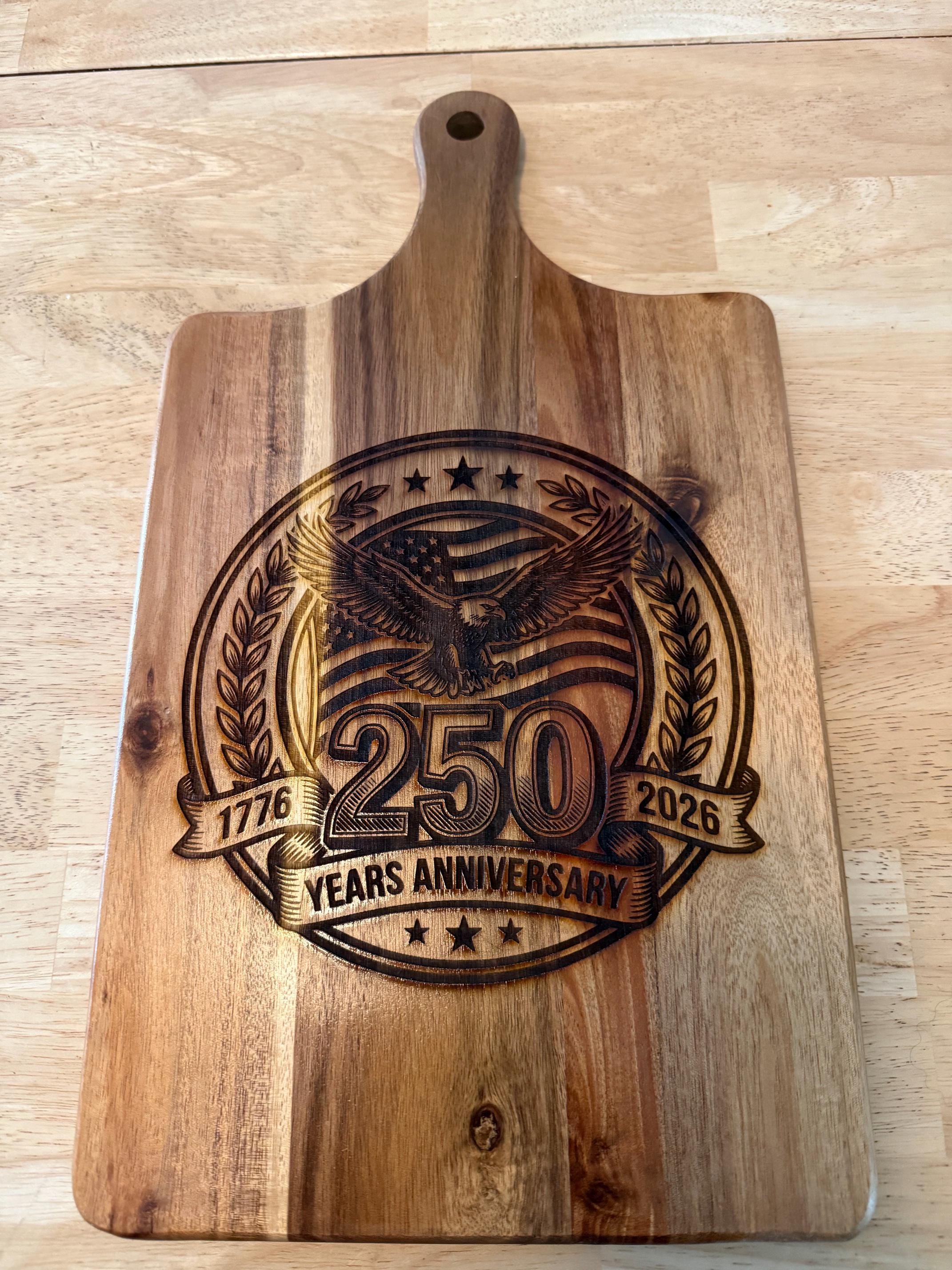 Celebrate American heritage with this beautifully engraved “250 Years of Freedom” cutting board, featuring a bold eagle, American flag, and commemorative 1776–2026 design.